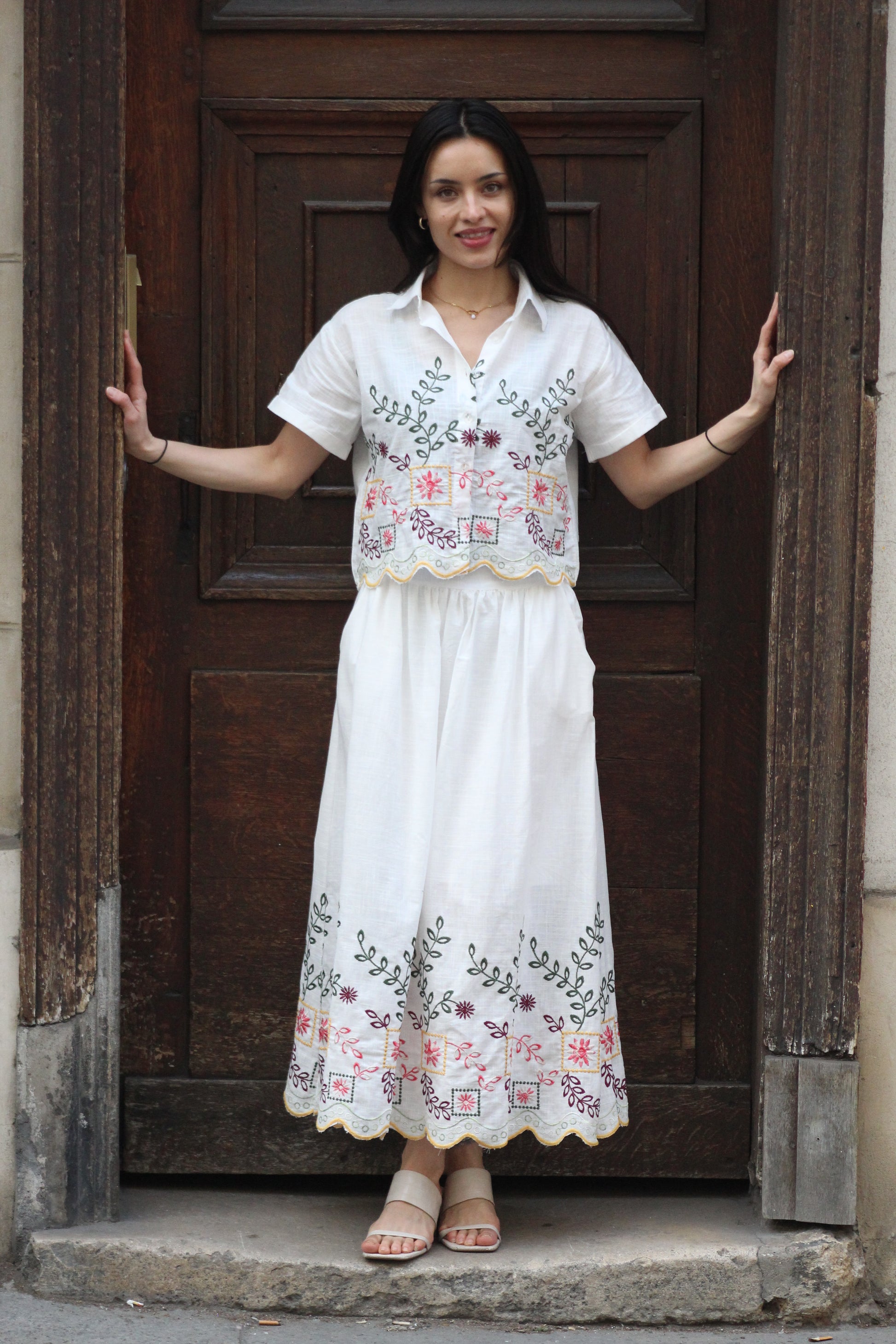 Ornée d’une broderie florale délicate en bas de pièce, elle dévoile un jeu de motifs graphiques aux accents artisanaux. Les finitions festonnées soulignent son caractère précieux et apportent une touche de féminité subtile.